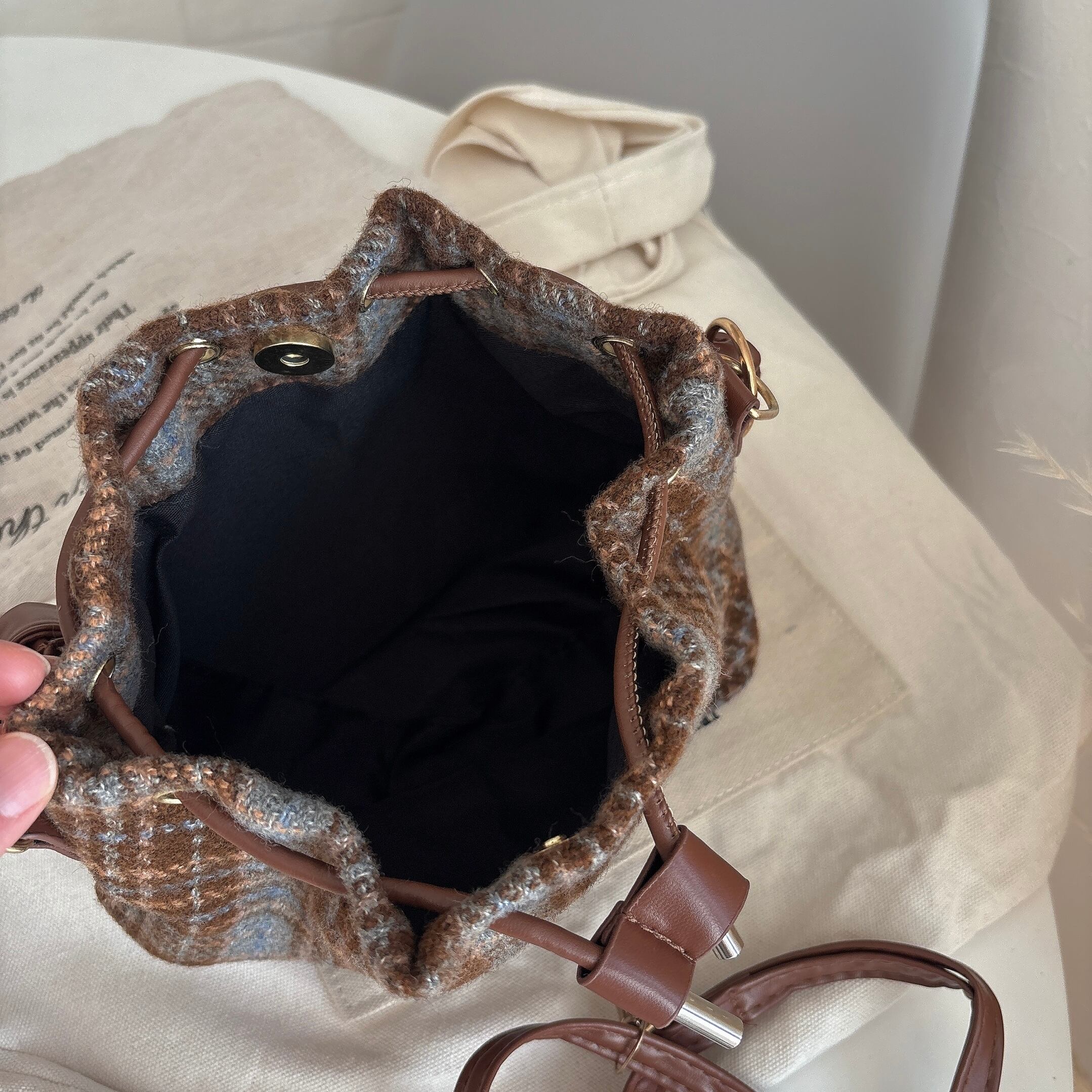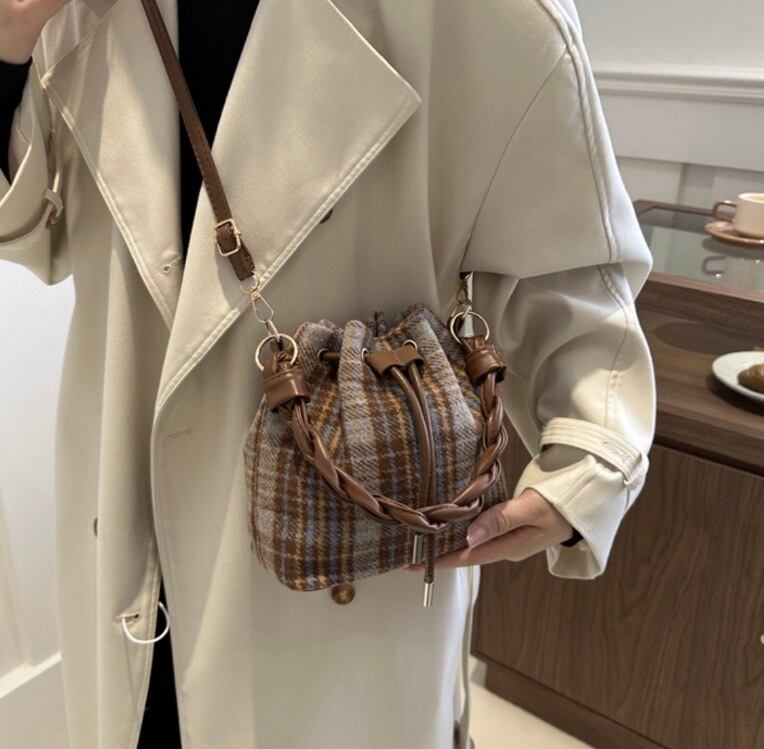 流行のbrown×blueのチェックバッグ入荷しました♡コロンとしたフォルムや持ち手のデザインまで可愛いです♪軽くて肩掛けにも出かけるのでおすすめです♡