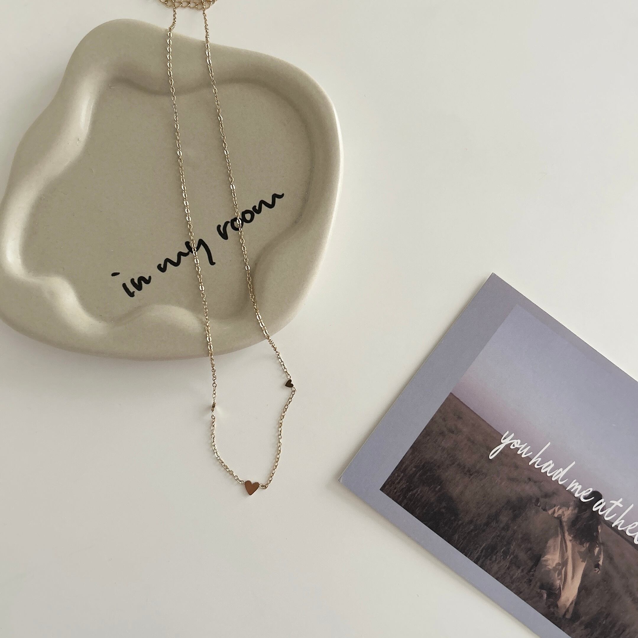 小さなハートがちょこんとついていて可愛い細身のチェーンネックレス♡優しい色味のゴールドで首元を大人可愛いくしてくれます♪